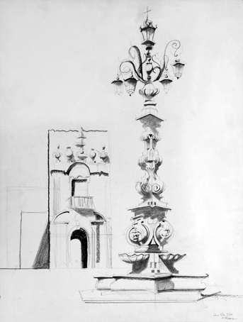 50 Kandelaber und Portal, sign. Sevilla 5.66 K.Kunz, Bleistift/Kohle, 65 x 50 cm