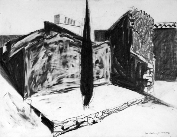 55 Gemäuer mit Zypresse, sign. San Martino, 5. 64 K.Kunz, Kohle, 50 x 65 cm, Motiv verwendet auf dem Ölgemälde WV 531, Ampurias