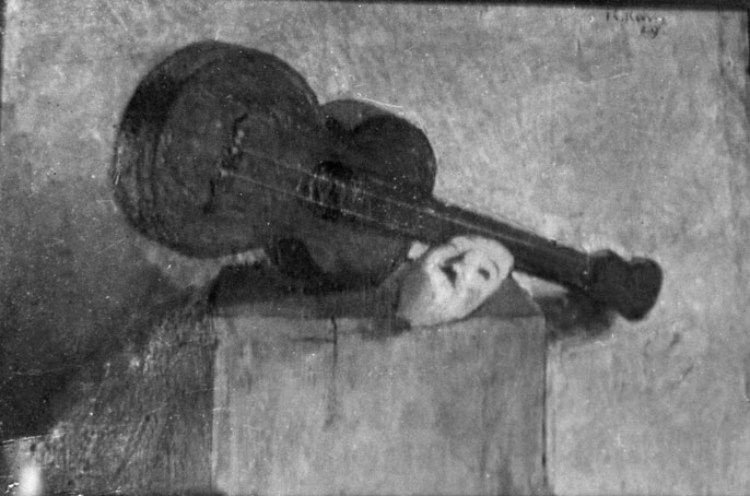 4 Gitarre mit Maske, ca. 1929, Dekorationsfarbe, ca. 65 x 100 cm,