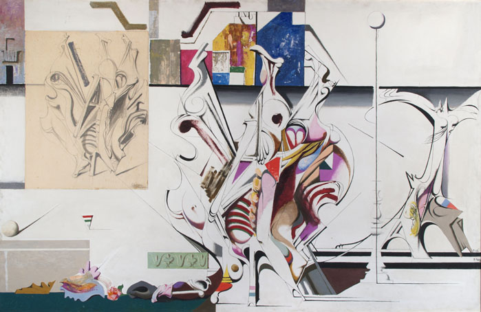 398 Dreiklang, Juli 1962, Öl mit Collage (Bleistiftzeichnung) auf Hartfaser,