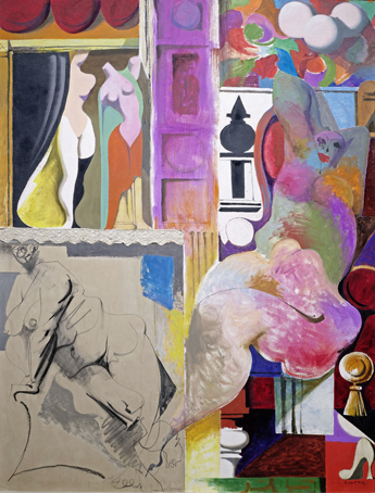 442a Im Frauenhaus, Dezember 1963, Öl mit Collage (Aktzeichnung) auf Hartfaser,