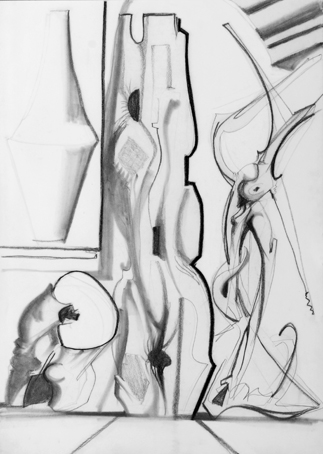 46 Stillleben mit Holzstück, 1959, unsig. Bleistift/Kohle, 65 x 50 cm